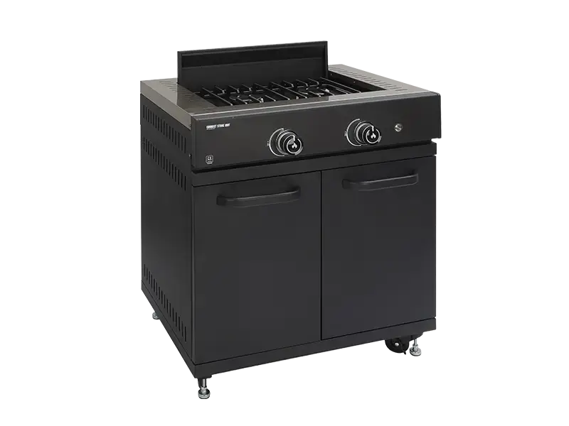 However, the outdoor stove unit is equipped with this innovative system when paired with the GRLLR Plancha, which ensures the flow of fats and oils into the fat cup located beneath the surface of the stove and accessible through the cabinet.