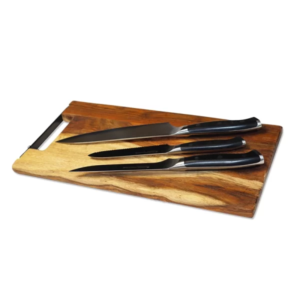 Chop Chop Chop! That’s the sound that makes us wonder what the chef is cooking today. This knife set comes with a Pure Rose Wood chopping board that provides a durable surface for all your cutting and chopping needs. Rose wood is known for its non-porous surface properties, which is ideal for outdoor cooking and grilling, as it absorbs less bacteria or odours. Perfect for both home glillers, as well as professional chefs, this board doubles as a stunning serving platter for cheeses, meats, grilled veggies and more.